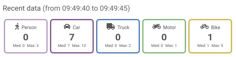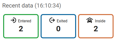 The rectangles show the number of entered and exited objects detected as well as those of remaining inside of the specified area, that occurred in the last aggregation interval, of each object type associated with the Traffic Counting. They are a good way to read its data at a glance.