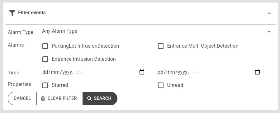 - Detection type (Intrusion-, Multi Object- and Crowd Detection or 'Any' alarm type)