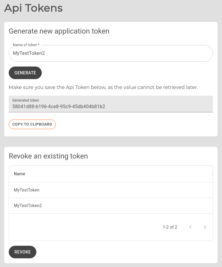 - Tokens can be generated or revoked here. To create a new token, give it a name that is easy to identify it by, then press Generate.