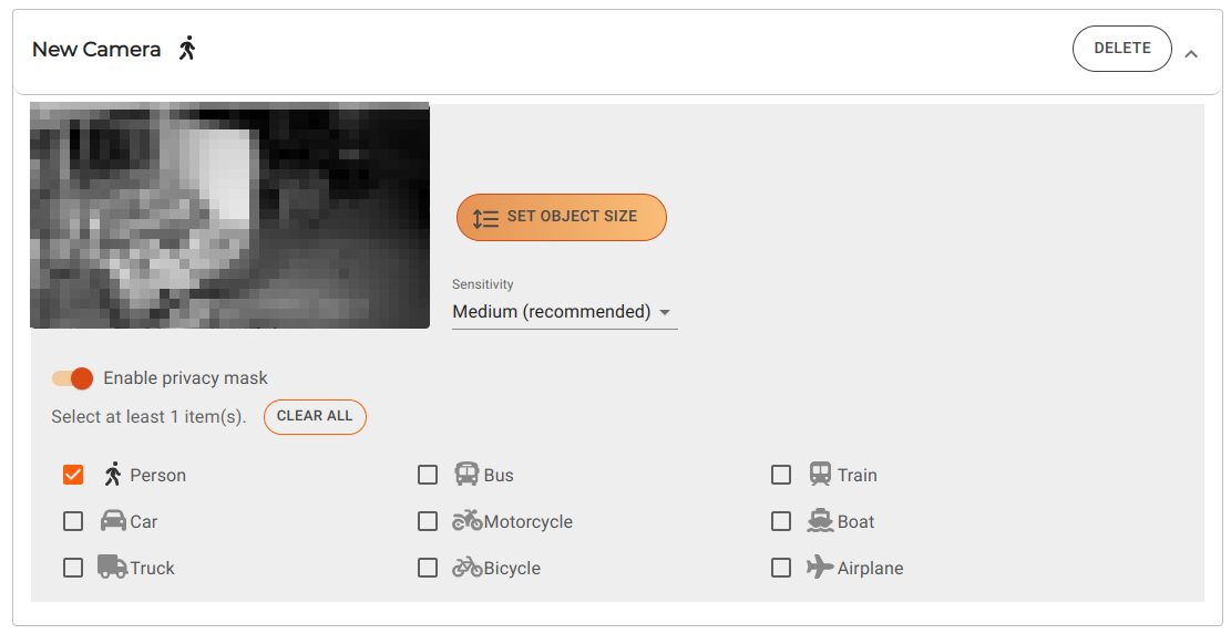 - Enable privacy mask: Tick this button to enable blurring of detected object types of your choice; you may choose multiple object types from this list (Person by default) to detect and apply a blurring mask on.