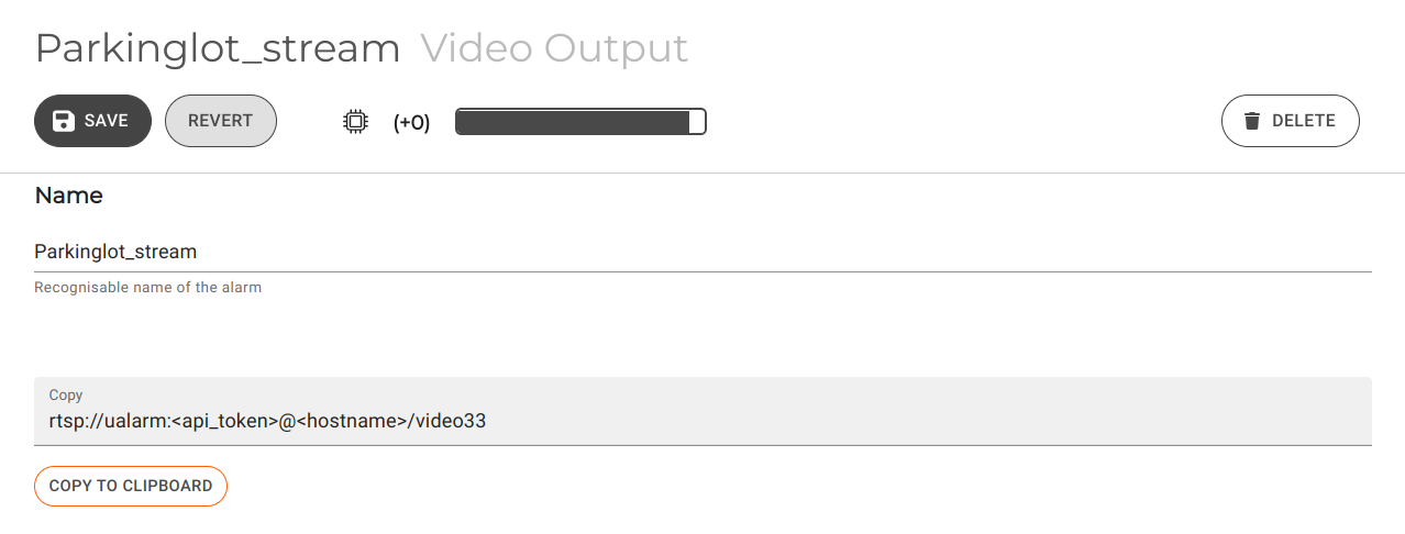 Your Video Output's URL is now ready to be used, in the following format: rtsp://ualarm:<api_token>@<hostname>/video<number>