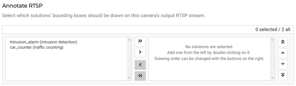 - Annotate RTSP (optional): Select which registered solutions' bounding boxes should be drawn on this camera's output stream.
